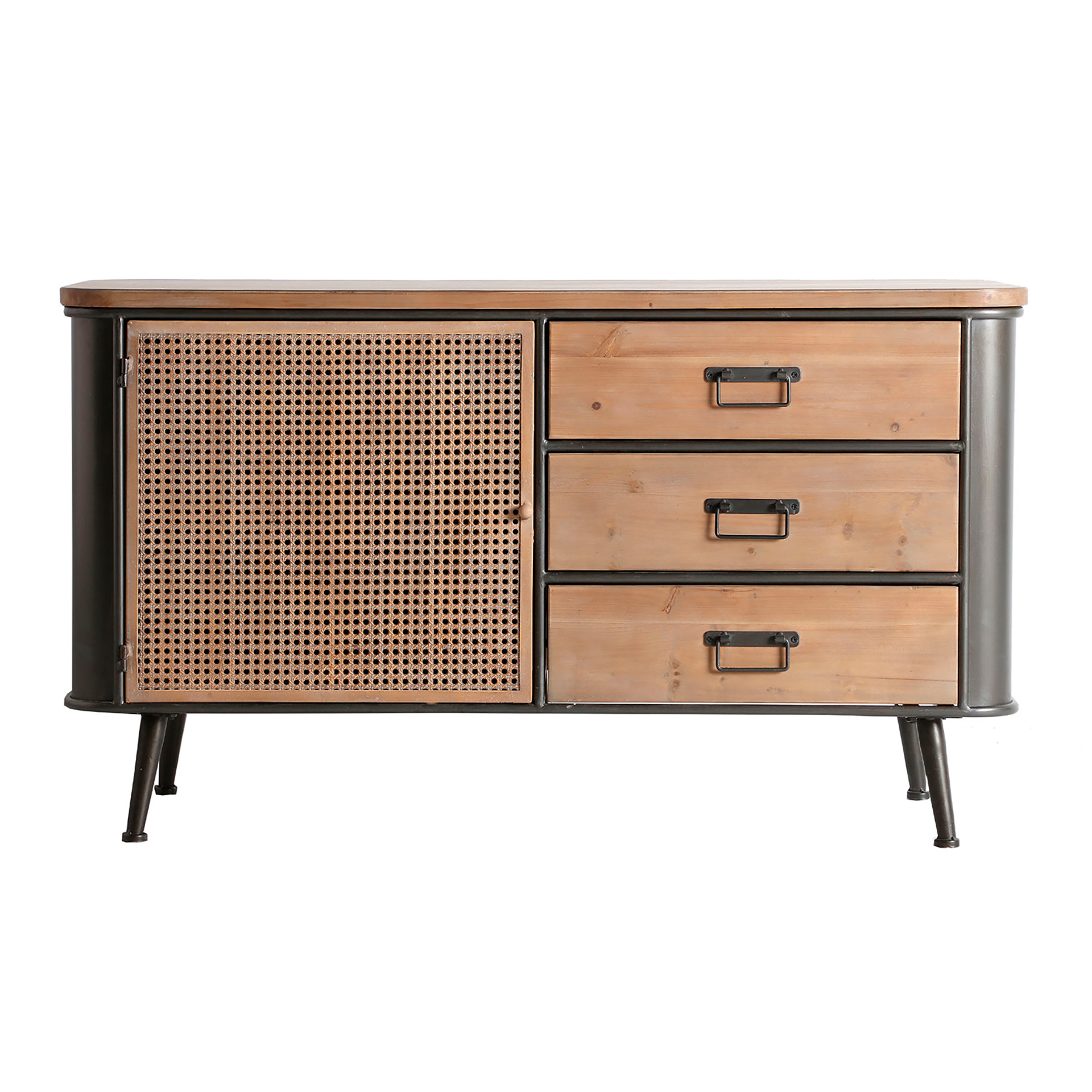 Aparador rectangular tirkane de estilo industrial, fabricado en hierro en color gris, combinado con madera de abeto en color marrón. Producto desmontable.