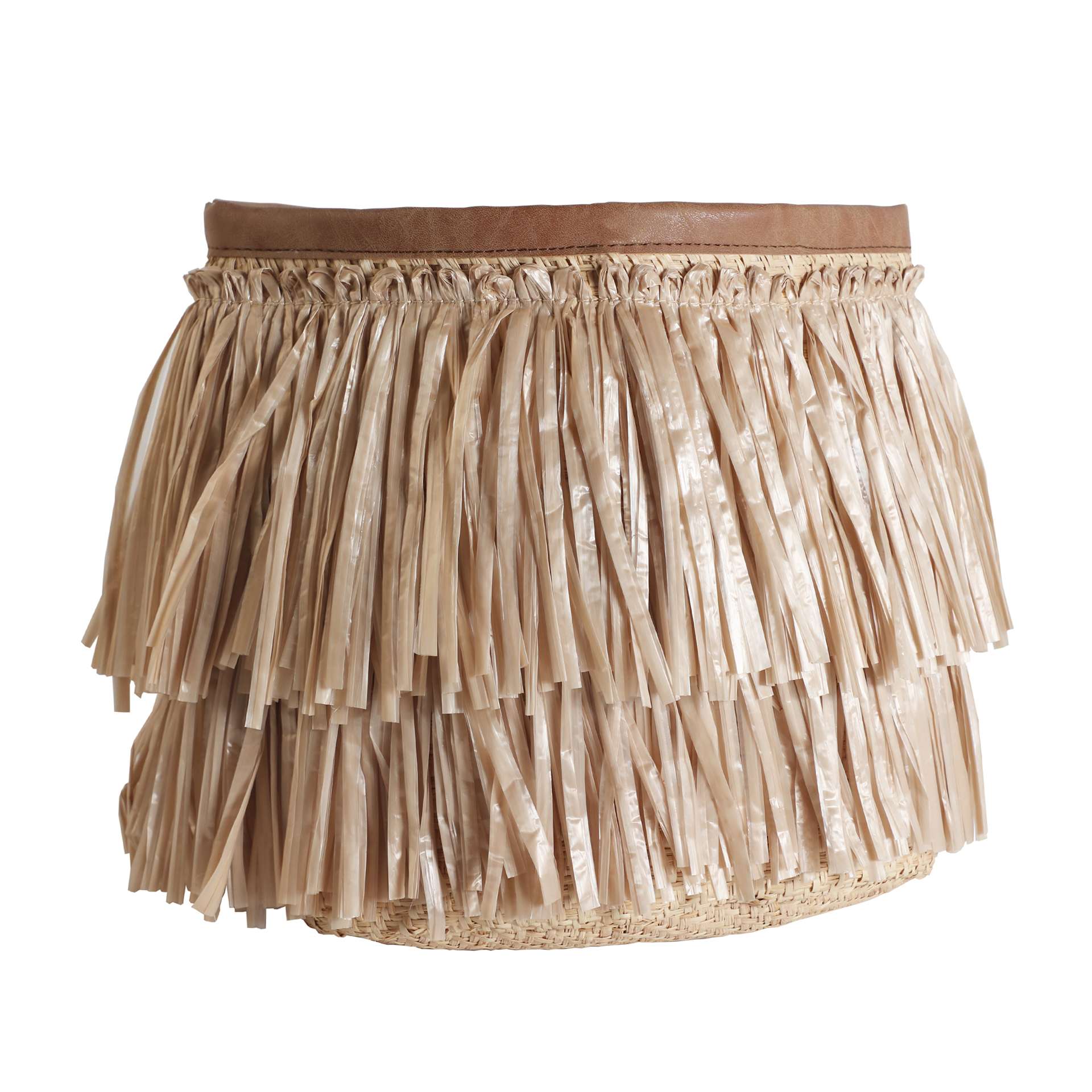 Bolso cuadrado bhuv de estilo boho, fabricado en fibra natural en color marrón, combinado con rafia y poliéster.