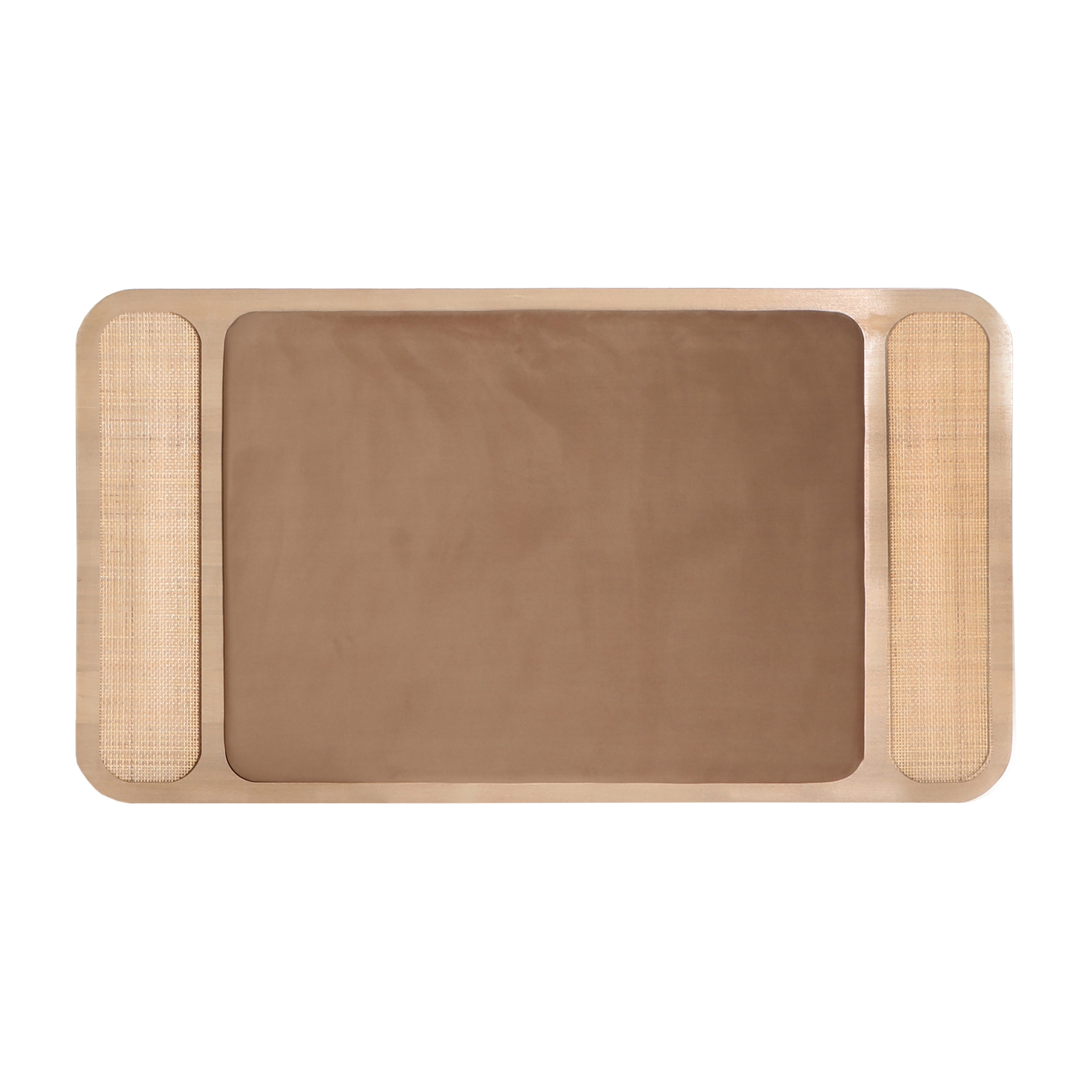 Cabezal rectangular larvik de estilo nórdico, fabricado en madera de pino en color marrón, combinado con ratán en color marrón claro y terciopelo en color camel.