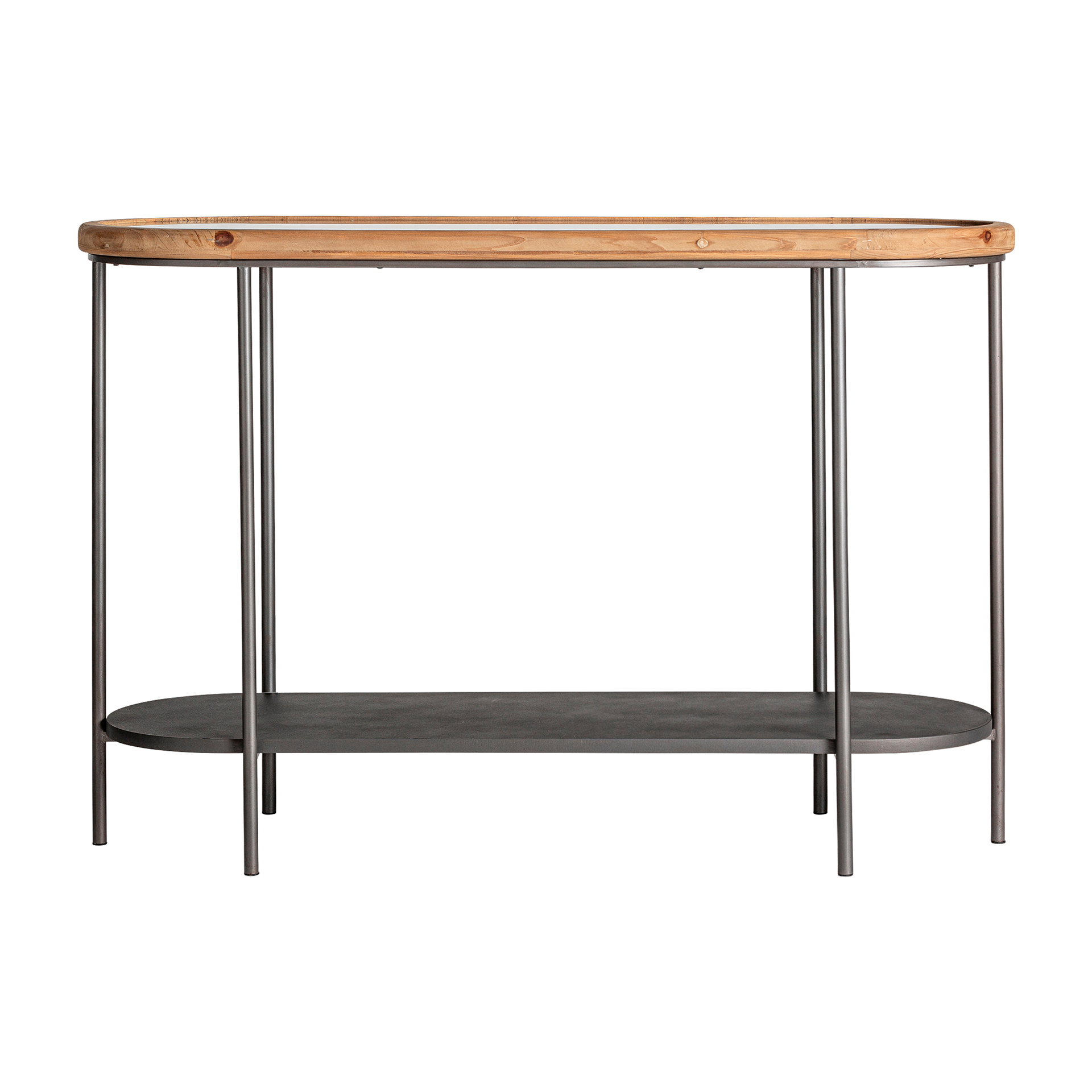 Consola oval solden de estilo contemporáneo, fabricado en madera de abeto en color marrón claro, combinado con hierro en color natural y vidrio en color transparente. Producto desmontable.