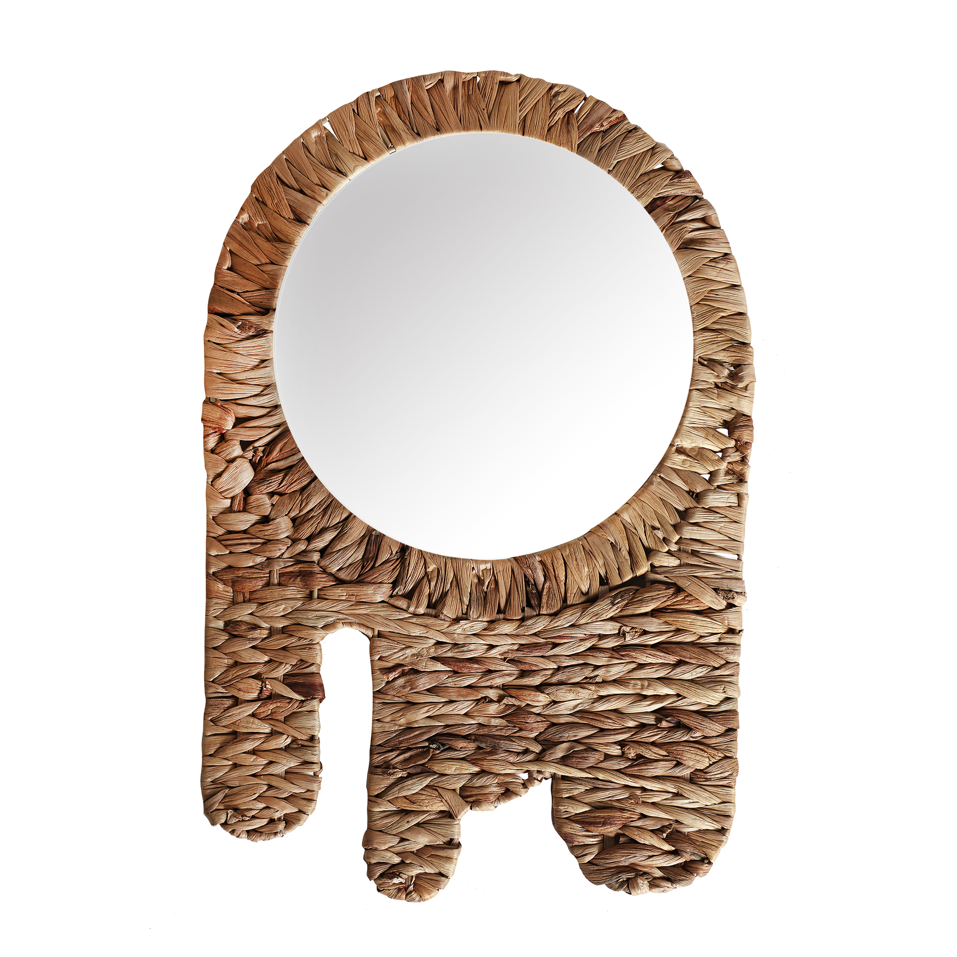 Espejo irregular blair de estilo boho, fabricado en paja en color marrón, combinado con espejo y hierro.
