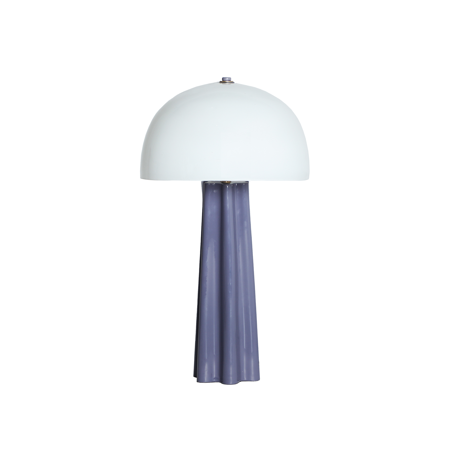 Lámpara de sobremesa Amalfi de estilo moderno, fabricado en hierro en color dorado, combinado con vidrio en color blanco en color morado.