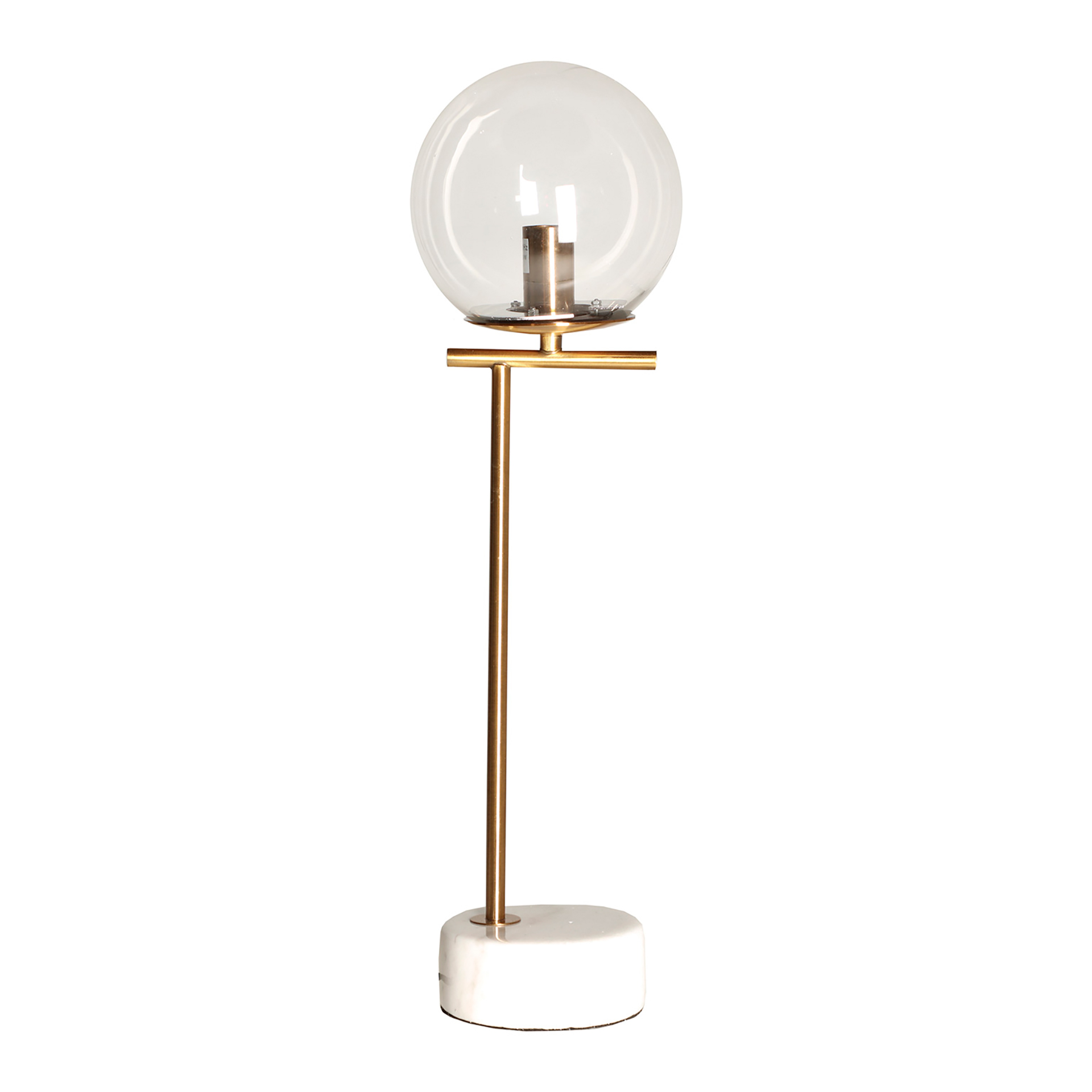 Lámpara de sobremesa redonda leba de estilo art deco, fabricado en hierro en color oro, combinado con vidrio en color transparente y mármol en color blanco. Producto desmontable.