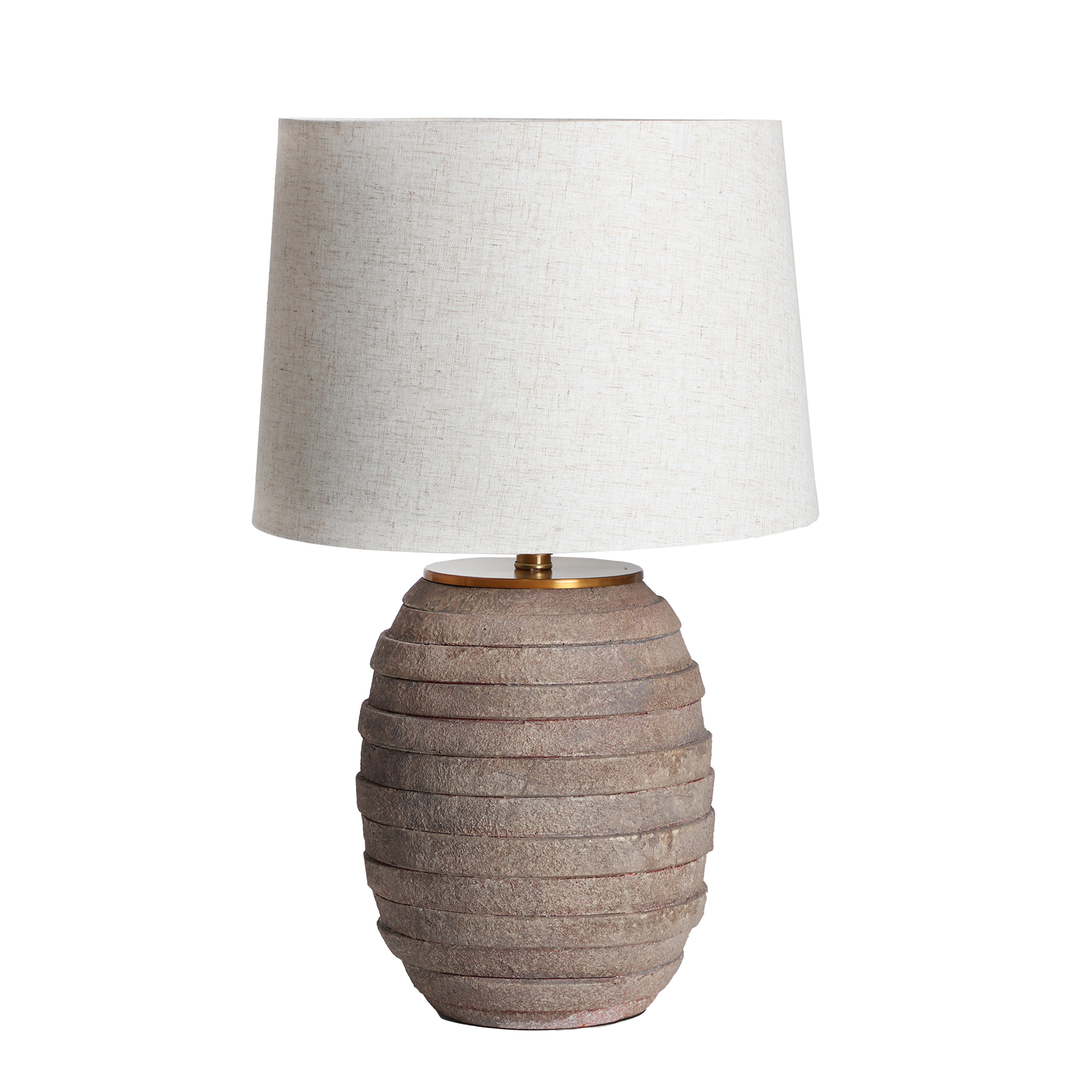 Lámpara de sobremesa nora de estilo provenzal, fabricado en cerámica en color marrón con acabado envejecido, combinado con hierro en color oro y lino en color blanco roto. Producto desmontable.