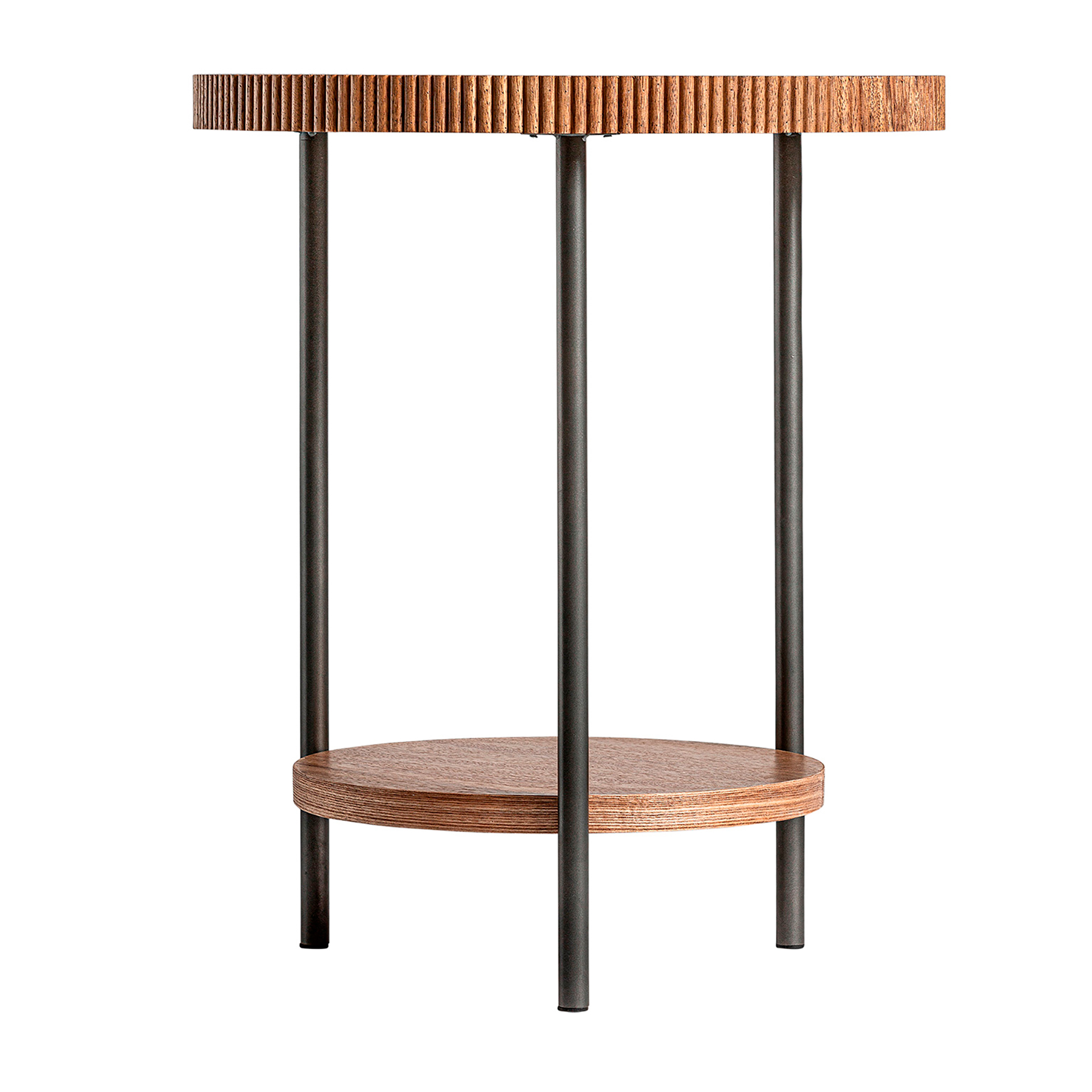 Mesa auxiliar redonda asroa de estilo nórdico, fabricado en madera de abeto en color marrón, combinado con hierro. Producto desmontable.