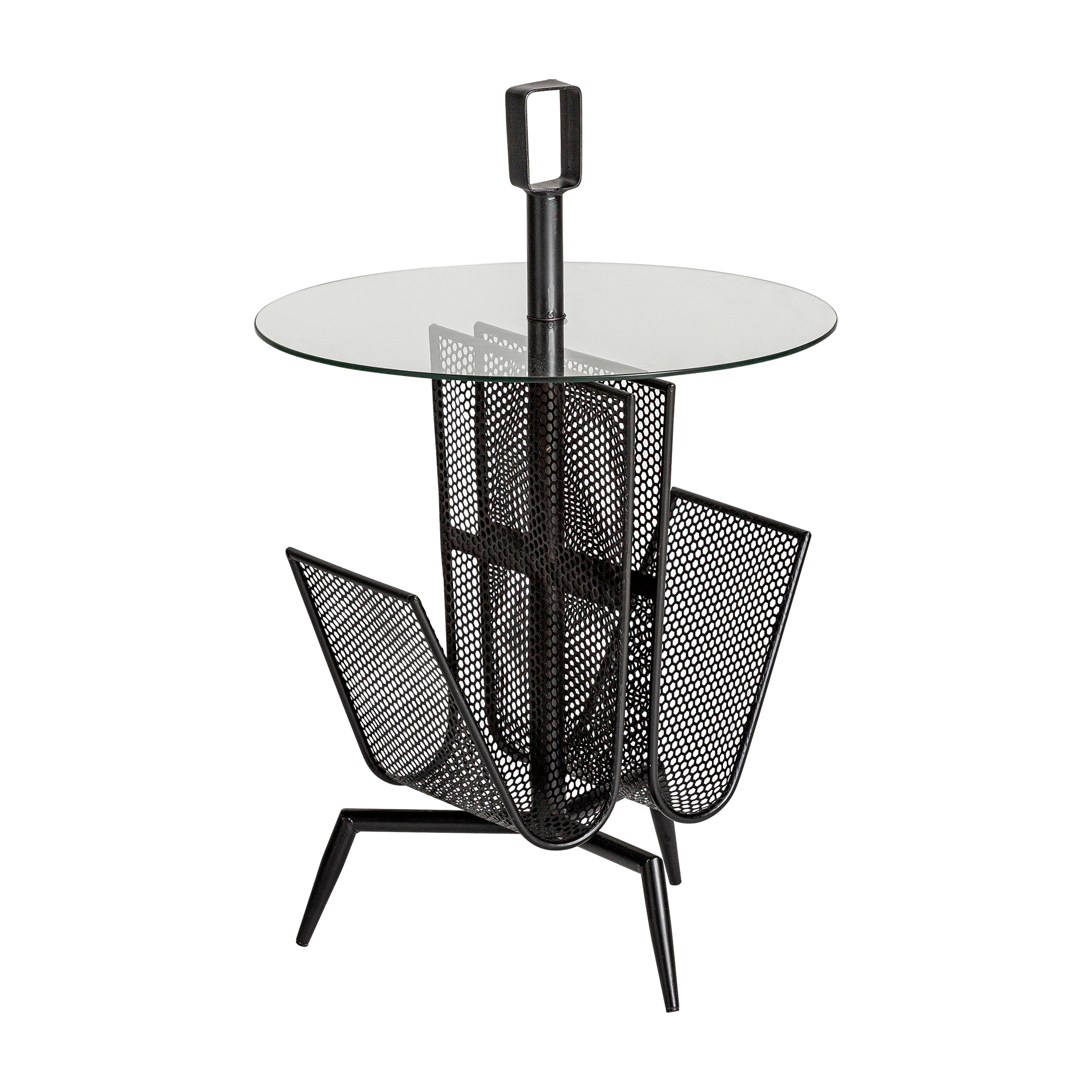Mesa auxiliar redonda fussen de estilo art deco, fabricado en hierro en color negro, combinado con vidrio en color transparente. Producto desmontable.