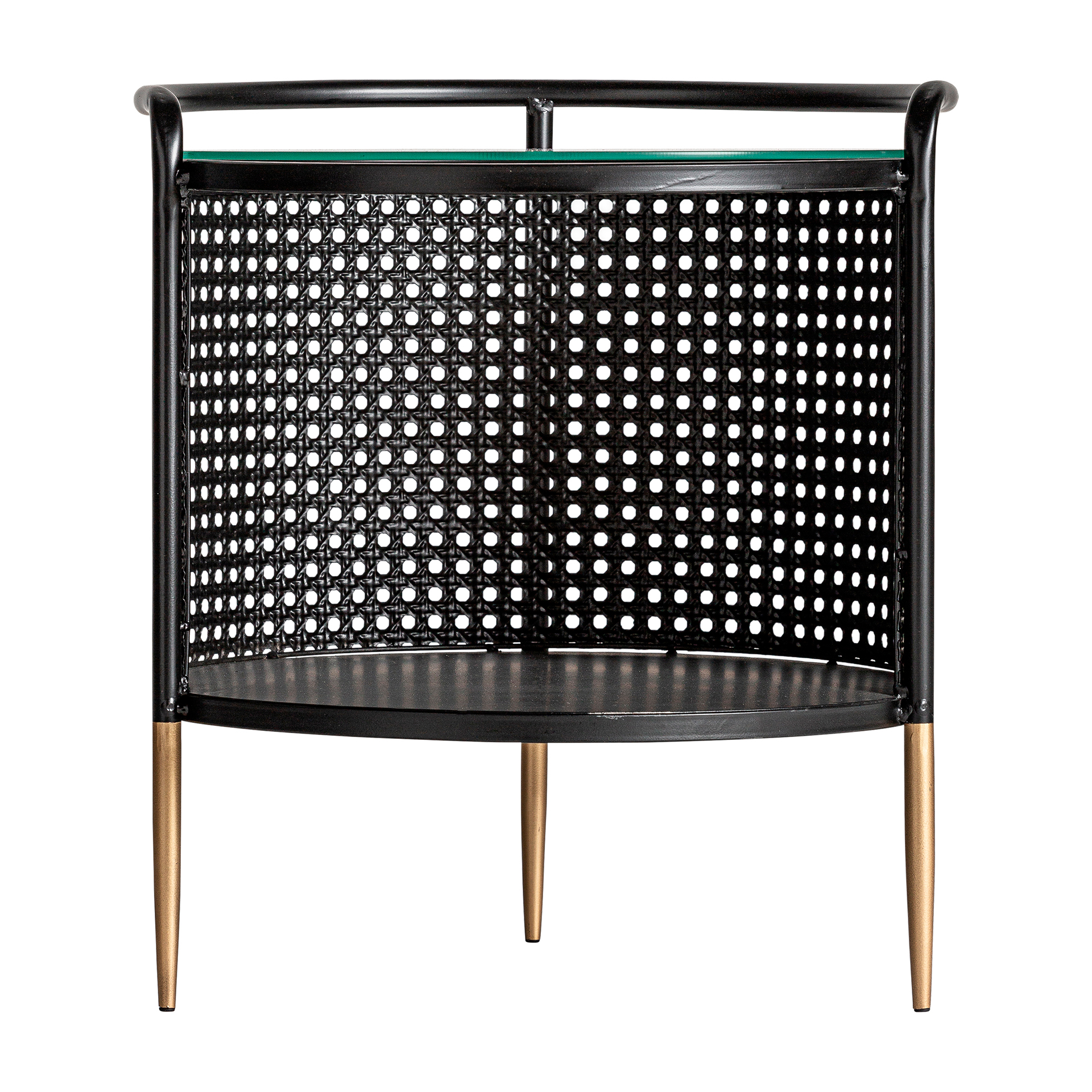 Mesa auxiliar redonda fussen de estilo art deco, fabricado en hierro en color negro en color oro y vidrio en color transparente. Producto desmontable.
