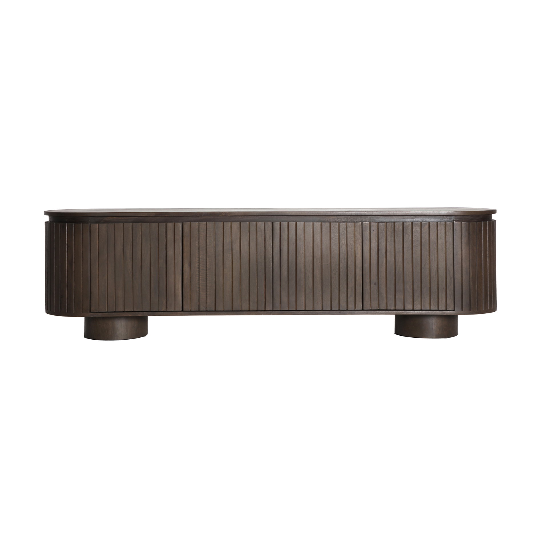 Mueble tv oval kolga de estilo art deco, fabricado en madera de mango en color marrón.